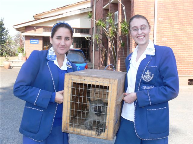 (Third pic - Grosvenor Girls' High School learners, Louise Joubert (left) and Rachel Van Rensburg, hold the pregnant female Vervet, paralysed in her lower body, who they watched over and fed in the school grounds last week until Monkey Helpline arrived to rescue her).